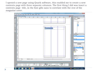 I opened a new page in Quark software to create a three-column contents page, inserting a title in Gill Sans font to match the magazine cover. I added the main front page image cropped to the right size and largest to feature the biggest article. Following this, I included information on both feature and regular articles, then additional images with page numbers to complete the contents page criteria, along with a large pink rectangle.
