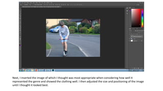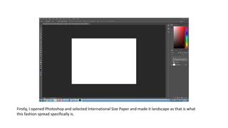 First, the author opened Photoshop and selected a landscape format to create a fashion spread. Next, they inserted an image that well represented the genre and showed the clothing, adjusting its size and position. Finally, the author added pricing in a small lime green font, adjusted the brightness and contrast to enhance the greens in the image, and captured a screen grab of the final fashion spread.