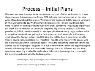 Emma created a fashion magazine for her final major project. In her initial planning, she chose to focus on fashion but realized through research that she needed to target her survey to those more involved in fashion to get better feedback. During production experiments, she tested different lighting, fonts, and images. She found that orange gels worked well to add depth to photos while blue gels did not have as much impact. For pre-production, she created style sheets with color schemes and layout ideas. In later weeks of production, she shot photos for covers, ads, and spreads, finding the projector helpful to create a feature on a photographer.
