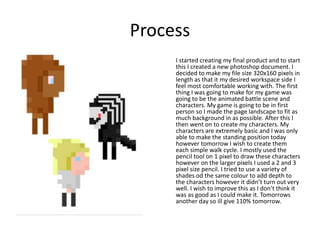 The student created several assets for their game project in Photoshop over three sessions. In the first session, they created character sprites and backgrounds. In the second session, they created the game box art and cartridge, which they were proud of. In the third session, they created the battle scene background but were less pleased with the outcome. They used various tools in Photoshop like the pencil, pen, and shape tools.