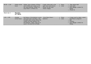 The production report outlines four shoot days to film scenes for a stop motion film about Eminem. Shoot day 1 took place at a school and involved taking pictures of actresses to create stop motion. Shoot day 2 was filmed at a house and involved more scenes with actresses. Shoot day 3 was again at the school and filmed a writing scene. Shoot day 4 involved filming with an iPhone at the school and re-filming bedroom scenes at a house with extra footage leading upstairs. The film required actresses, cameras, and props like scarves and beds on the various shoot dates at school and home locations.
