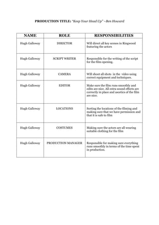 Hugh Galloway will serve as the director, script writer, camera operator, editor, locations manager, costumes manager, and production manager for the production of "Keep Your Head Up" by Ben Howard. Thomas Baldwin will star as the main character with the most screen time. Declan Berry and Alex Hdidou will also have leading roles as guiding friends to Thomas Baldwin's character. Eva Konczak will appear on the album cover and in a supporting role as another friend.