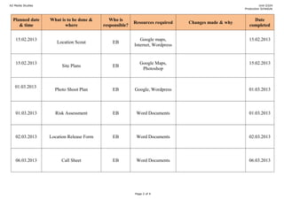 This production schedule outlines the planning and production process for a media project by Ellen Brooking. It details tasks such as writing a treatment, budget, script, storyboard, location scouting, and filming over various planned dates from January to March. Resources required are listed for each task. Changes made include continuing the storyboard by hand instead of using a tablet and altering the filming location and plot due to various factors. A contingency plan is also provided to address potential issues like bad weather, equipment damage, or problems with locations or cast.