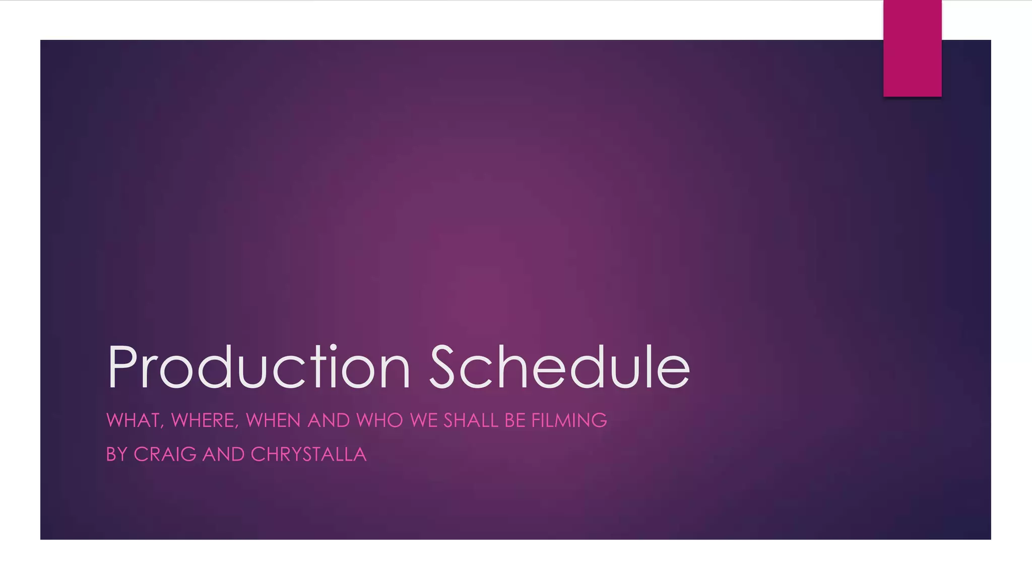 The production schedule outlines three filming locations - a sports hall, classroom, and house. Filming is scheduled for October 8th, 12th, and 14th with a review and potential reshoots on the 18th. The main prop is a possessed doll that will be used as the plot device in the horror film. The main characters of Katie and Daniel will be portrayed by Katie and Max, with extras filling minor roles as bullies or background students.