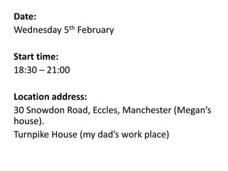 Megan Robinson has scheduled a production shoot from 18:30-21:00 on Wednesday 5th February at her house in Manchester and her father's workplace. She will be acting as the director, cameraman, production runner, and producer. The schedule outlines the script pages and locations that will be shot each evening, including an interview room, lounge, study room, hall, and bedroom. Safety notes refer to a risk assessment and no transportation is needed between locations.