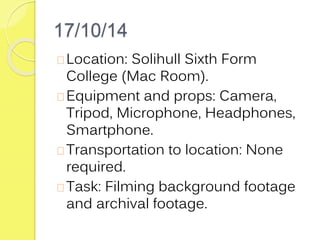 This production schedule outlines the filming locations, equipment, transportation, and tasks for the documentary "#SELFIE" over several dates in October and November. The documentary is being produced by Joseph McElligott, Hannah Fennell, Connie Ashton and Hayley Soen for BBC Three. Filming will take place at Solihull Sixth Form College and in Solihull Town Centre and will include background footage, interviews, and footage of people taking selfies.