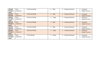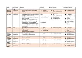 The document outlines the production schedule and tasks for a film project. It includes dates for production activities like filming, locations, needed equipment, and people involved at each stage. Post-production work like importing footage, editing, and audio matching continued from December 2015 through January 2016. The producer/director worked on the film using Adobe Premiere on a computer.
