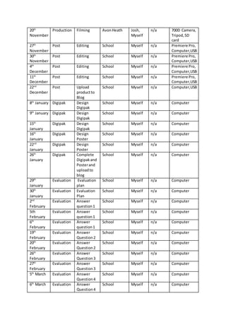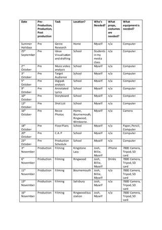This document contains a production schedule for a media project taking place from summer holidays through March. It includes pre-production tasks like genre research, storyboarding, and location recces. Production will involve filming at various locations in October and November with a cast and crew. Post-production includes video editing in November and December, followed by designing packaging and posters in January. Evaluation of the project will occur from late January through March with questions uploaded to a blog by mid-March.