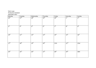 This production schedule outlines Demi Lowe's work for December 2012. It lists each day of the month and leaves most of the days blank, suggesting an open schedule with potential for work on any given day. The schedule provides a high-level overview of Demi Lowe's availability without specifying any particular production details for December.