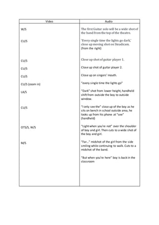 1) The document outlines various camera shots and angles for filming a music video. It includes wide shots, close ups, over the shoulder shots, and tracking shots of both the band performing and a boy and girl.