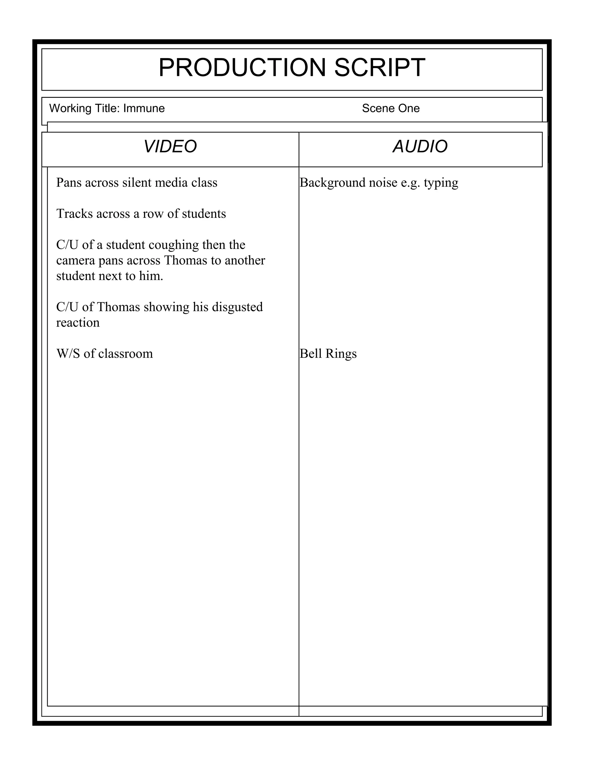 A student in a media class coughs, catching the attention of Thomas sitting next to him. Thomas reacts with disgust to the cough. The wide shot establishes the classroom setting with students working silently as background noise and a bell can be heard.