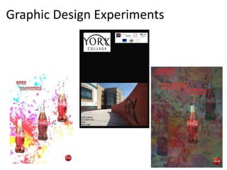 The document discusses different graphic design, video game, and radio production experiments the author conducted. For graphic design, the author created a poster advertising Coca-Cola using layers, backgrounds, and the Coca-Cola logo. For radio production, the author made a Halloween-themed Coca-Cola advertisement but notes the sound effects were too loud. For video games, the author animated a simple side-scrolling game inspired by Super Mario Bros. The author believes the poster best advertised the product due to its simplicity, and the radio advertisement was most professional due to fitting the Halloween theme through editing and voiceover.