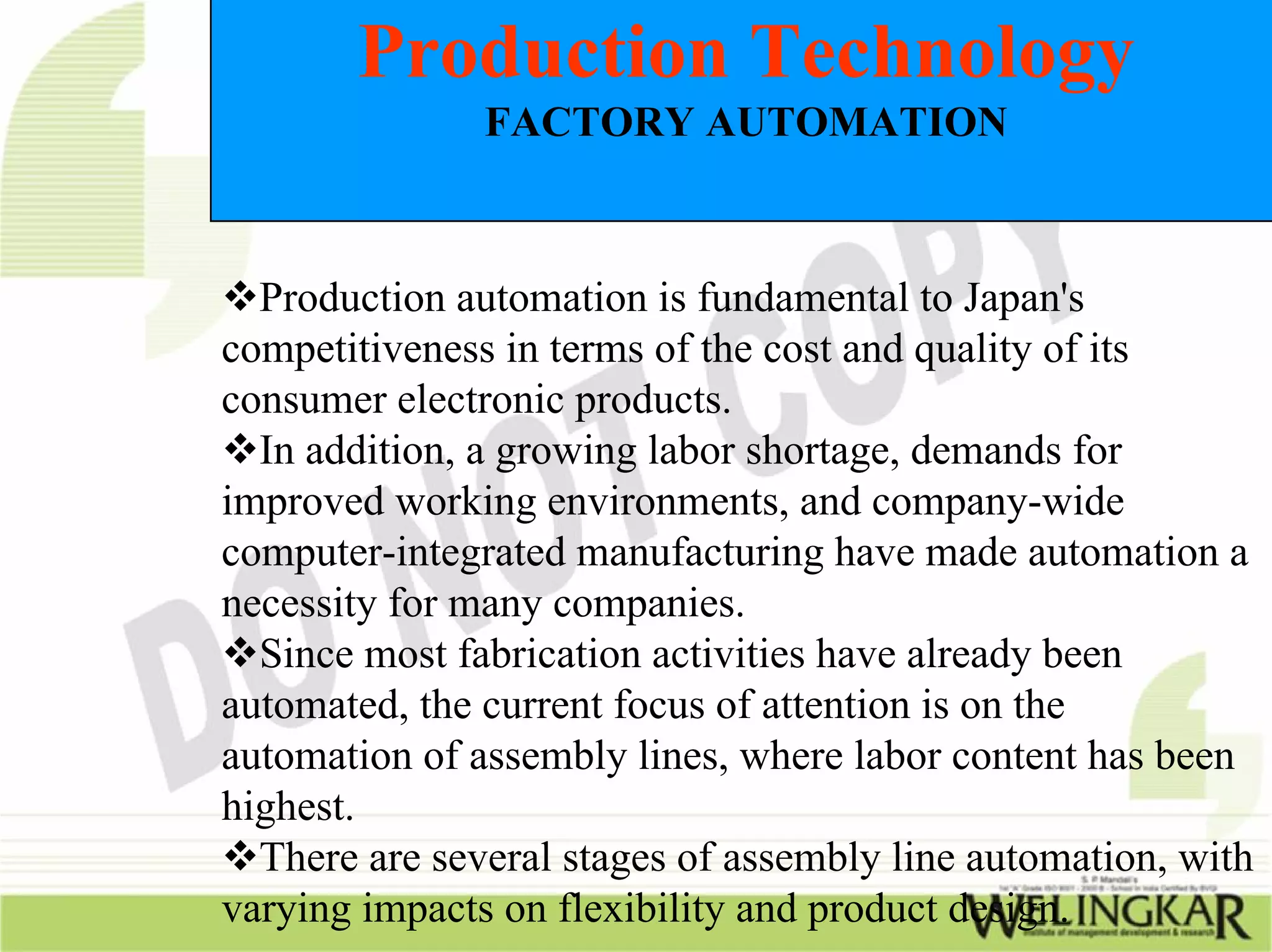 The document discusses the role of factory automation in Japan's competitiveness within the consumer electronics sector, highlighting its necessity due to labor shortages and demands for improved work environments. It details various generations of assembly line automation, benefits like reduced lead times and defects, and the shift towards miniaturization requiring specialized equipment. Key automation strategies and principles are outlined, along with potential advantages for productivity and efficiency across different manufacturing industries.