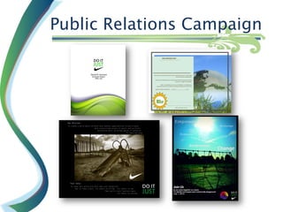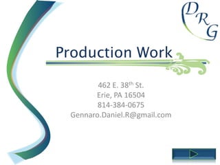 This document provides a summary of production work including published press releases and articles, media promotions, event planning, newspaper ad productions, graphic design, audio samples, and radio productions. Specifically, it mentions an internship with a Democratic committee where the applicant produced a published letter to the student newspaper registering over 25 new voters. It also includes a published feature article, submissions to a university website, flyers for fundraising events, and graphic and newspaper ad designs. Audio and radio samples are available via links.