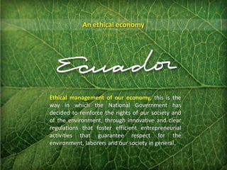 The National Government of Ecuador has established an ethical economy policy through regulations that promote entrepreneurial activities while respecting the environment, workers, and society. Key aspects of the new policy include a gradual reduction of the income tax rate, tax exemptions for new companies and investments in priority sectors like agriculture and renewable energy, deductions for productivity improvements, and benefits for special economic development zones to attract investment. The goal is to foster sustainable and inclusive economic growth through innovative tax policies and incentives.