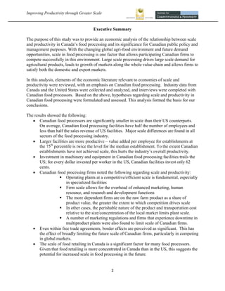 The document analyzes the relationship between scale and productivity in Canada's food processing sector. It finds that: