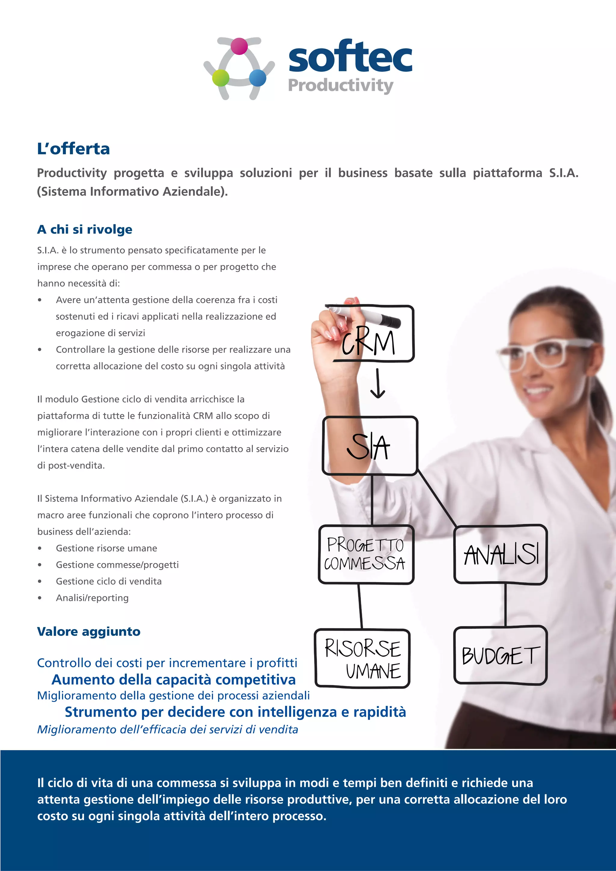 L'offerta productivity propone soluzioni per le imprese basate sulla piattaforma S.I.A., mirata alla gestione efficace di costi, risorse e progetti. Il sistema integra funzionalità CRM e analisi per ottimizzare le vendite e il reporting decisionale. S.I.A. supporta la pianificazione delle risorse umane, la gestione dei progetti e il ciclo di vendita, mirando a migliorare l'efficienza e la competitività aziendale.