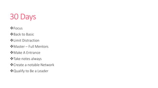 This document provides tips for improving productivity over 30 days including focusing on your purpose, limiting distractions, taking notes, creating a network, and qualifying as a leader. It notes that leadership requires commitment, seeing the bigger picture, learning from mistakes, and having a clear vision and motivating manner. Leaders answer a higher calling and their authority is always challenged.