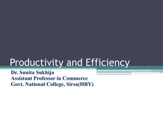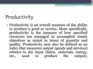 Productivity is a measure of how efficiently resources are used to produce goods and services. It is calculated as the ratio of output to inputs used. Productivity should not be confused with efficiency, which refers to getting the most out of a given set of resources. Productivity is broader and considers overall resource use. Factors that affect productivity include technical, financial, natural, managerial, social, administrative, quality of labor force, and size of industrial unit. Productivity can be improved through techniques like scientific management, work study, good employee relations, training, adapting to external environment, and continuous improvement. Measuring productivity is important for resource allocation, comparative analysis, economic forecasting, and policymaking.