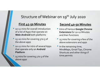 The webinar on July 19, 2020, hosted by CA Rajesh Pabari, focused on various productivity apps available for both web and Android platforms, offering insights on tools for task management, note-taking, and collaboration. Key topics included Google Chrome extensions, tips for Gmail, and effective use of digital tools for professionals. The presentation emphasized the importance of building productive habits and provided a comprehensive list of recommended apps and resources for remote workplace management.