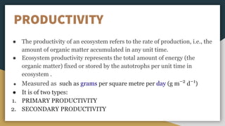 Ecosystem productivity measures the rate of organic matter accumulation, categorized into primary and secondary productivity. Primary productivity involves the energy captured by autotrophs through photosynthesis, further divided into gross (total organic matter synthesized) and net primary productivity (energy available after respiration). Secondary productivity reflects energy storage at the consumer level, where only about 10% of ingested food is absorbed by higher trophic levels.
