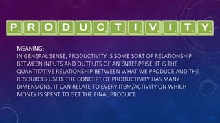 This document discusses productivity management. It defines productivity as the ratio of output to inputs. Productivity can be measured using trend, horizontal, vertical and budgetary analysis. Productivity involves measurement, evaluation, planning and improvement. Increased productivity benefits workers through higher pay and standards of living, and benefits organizations through higher production and profits. Factors affecting productivity include inputs, technology, management and external factors. Productivity can be improved through technology, employees, materials, processes and tasks. Common challenges in measuring productivity include measuring outputs and inputs accurately. Productivity models include partial, total factor, multi-factor and total productivity.