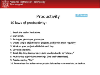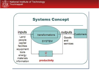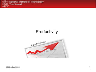 The document discusses definitions and concepts of productivity. It provides several definitions of productivity, including classical definitions that measure outputs relative to inputs needed. Productivity can be measured in various ways depending on the sector, such as hours to produce goods in a factory or revenue per employee in services. Higher productivity is important for economic growth and competitive advantage at the individual, organizational and national levels.