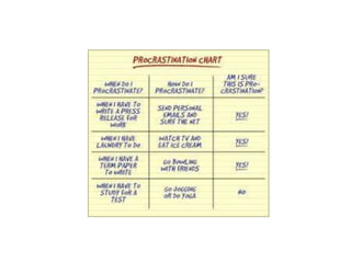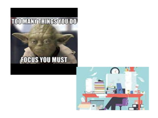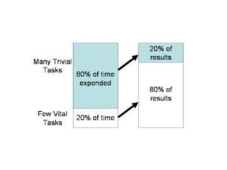This document provides numerous time management and productivity tips, including focusing on making every minute count, setting daily priorities like identifying your most important task, using a notebook to capture tasks and move them to a calendar, limiting email checking, saying no to most tasks outside your goals, following the 80/20 rule to focus on the most important 20% of tasks, delegating other tasks, having consistent morning and weekly routines, and using the Pomodoro Technique to focus in intervals separated by breaks. The overall message is on being intentional with your time by prioritizing key tasks and limiting distractions.