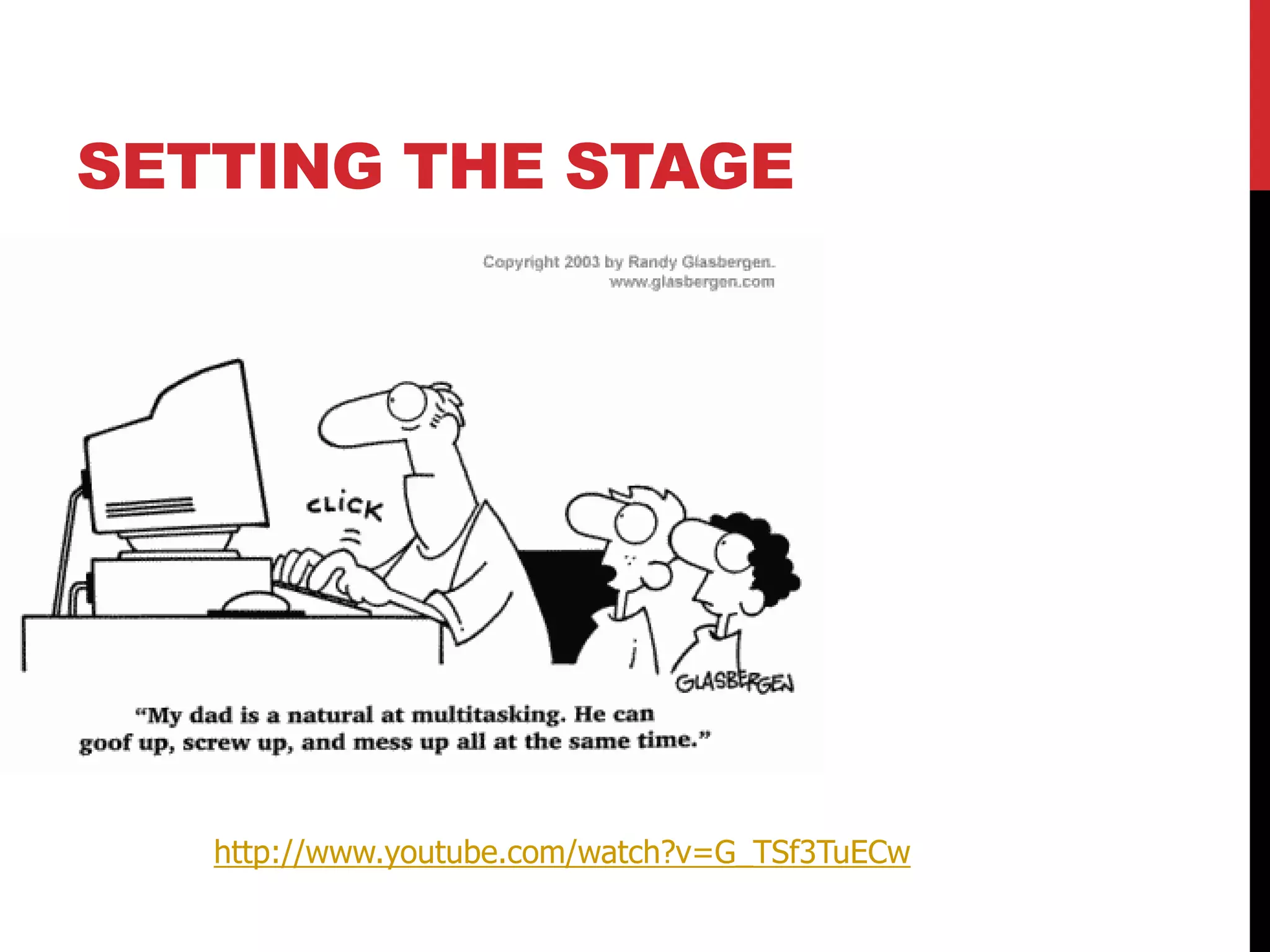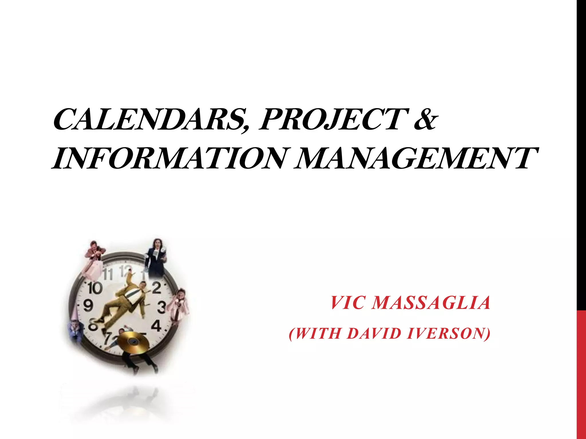 The document discusses various tools and methods for managing calendars, projects, emails, and information including the Getting Things Done (GTD) method, calendar management, project management software, and resources for productivity and organization. It provides an agenda covering email management, calendar management, project management, information management, and questions.
