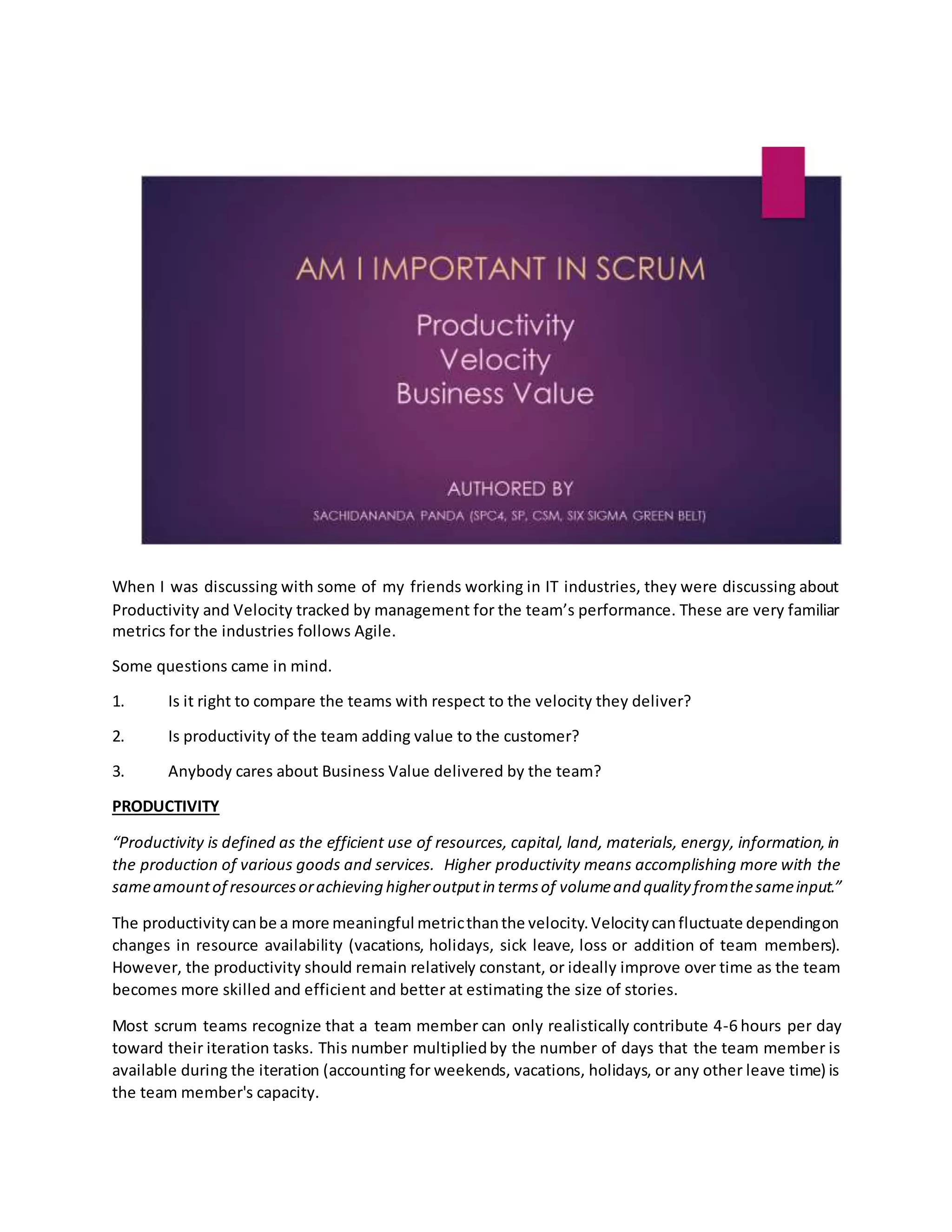 2. Productivity is defined as accomplishing more with the same resources and may be a more meaningful metric than velocity, which can fluctuate. Productivity remains relatively constant as a team gains experience.