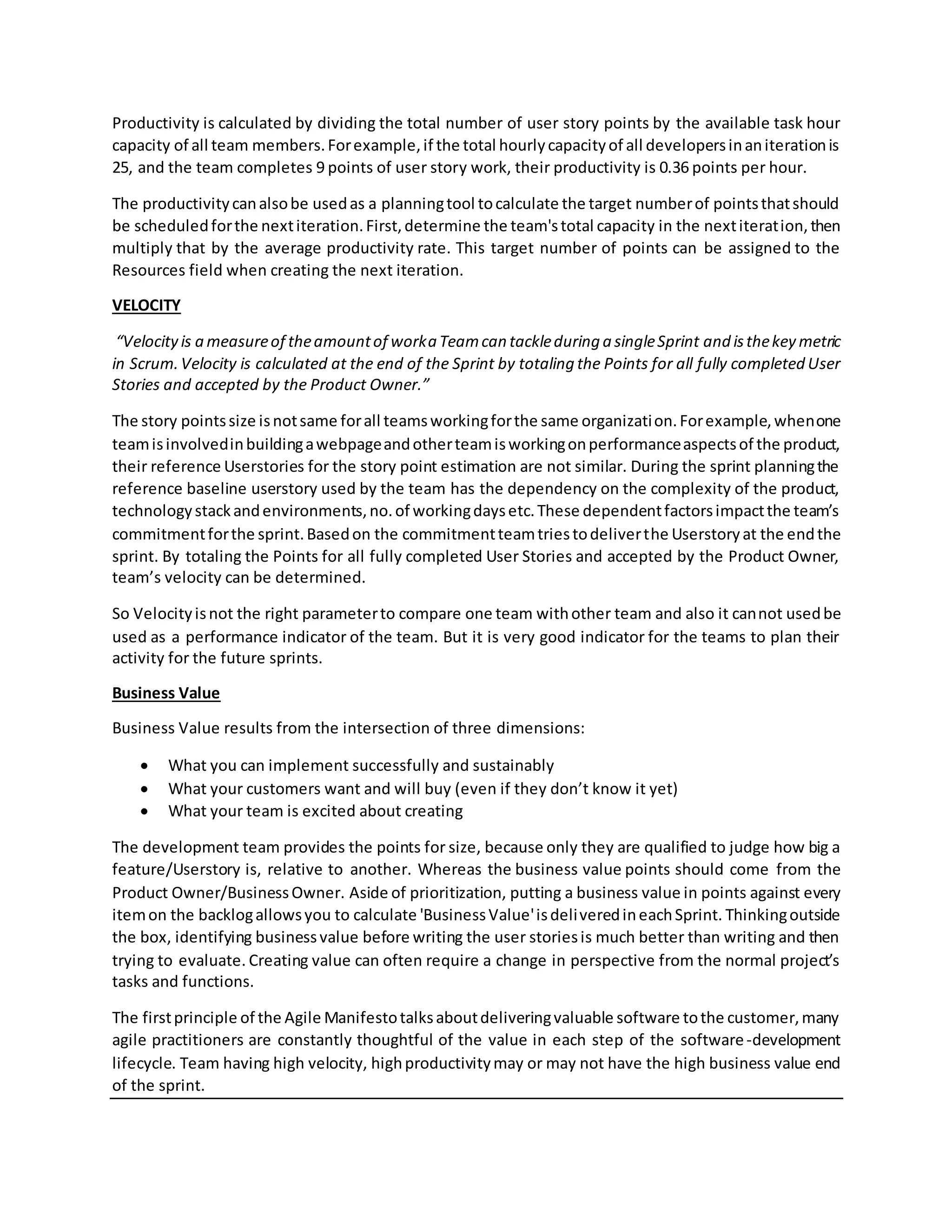 3. Velocity measures the amount of work a team can complete in a sprint but is not a good measure for comparing teams or evaluating performance, as story point sizes vary between teams. Business value, defined at the intersection of what can be successfully implemented, what customers want, and what excites the team, should be the key indicator used.