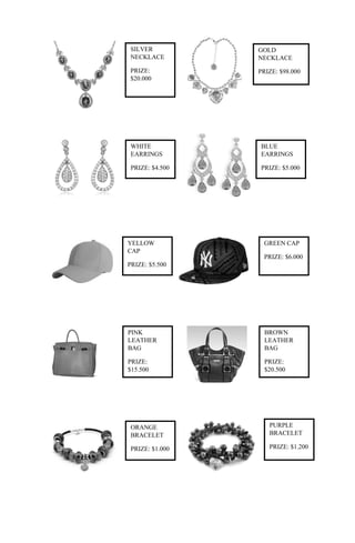 The document lists various items with different colors and materials including laptops, mobile phones, jewelry, bags, clothing, and accessories. Each item has an associated cash prize ranging from $1,000 to $280,000 depending on the item and its characteristics such as brand, materials, and features.