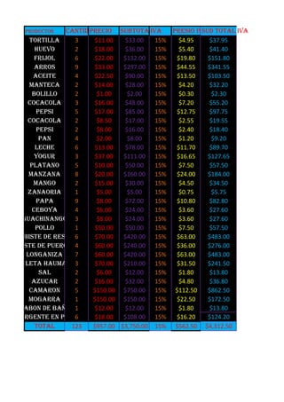 This document is a sales receipt listing various food and household items purchased along with their quantities, prices, subtotals, tax rates, and total costs. It includes items like tortillas, eggs, beans, rice, oil, bread, soda, milk, yogurt, fruits, vegetables, meats, seasonings, and cleaning supplies. The receipt totals 123 items purchased for $3,750 before tax, with a 15% tax rate applied, bringing the grand total to $4,312.50.