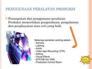 Dokumen ini membahas penggunaan dan penanganan peralatan produksi media, termasuk kamera, pencahayaan, audio, dan pengeditan. Setiap perangkat memiliki fungsi spesifik dan penting dalam menciptakan konten berkualitas, seperti perekaman, pengolahan suara, dan penyampaian visual yang efektif. Tugas dan keahlian yang diperlukan bagi para profesional di bidang ini juga dijelaskan untuk memastikan hasil produksi yang optimal.