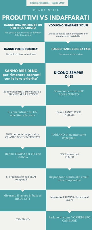 Il documento discute le differenze tra persone produttive e indaffarate, evidenziando che le prime hanno obiettivi chiari e sanno gestire le priorità. Le persone produttive sono concentrate sull'azione e sulla pianificazione, mentre le indaffarate si danno molte da fare senza un ordine. Infine, viene sottolineato come le persone produttive misurino il loro lavoro in base ai risultati anziché semplicemente sul tempo impiegato.