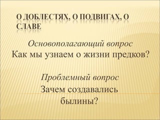 Документ описывает проект для учащихся 5-7 классов, сосредоточенный на изучении русских былин и их исторического значения. Цели проекта включают развитие информационной и коммуникативной культуры, а также воспитание патриотизма через изучение героев былин. Проект длится от двух недель до одного месяца и завершается презентацией материалов и оцениванием работ учащихся.