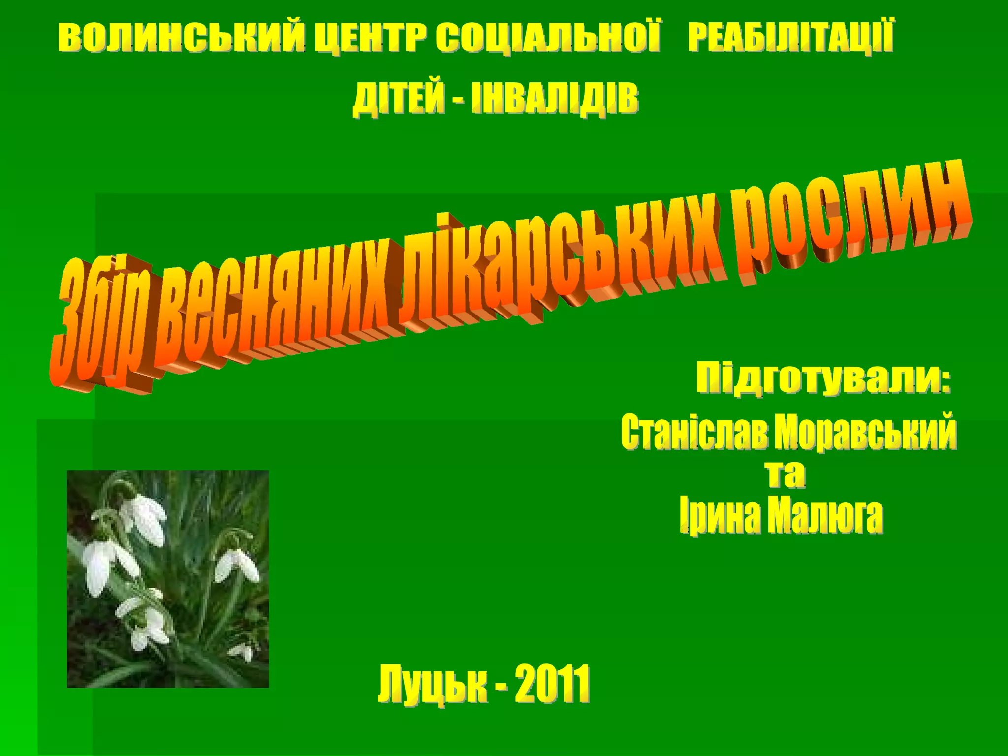 ВОЛИНСЬКИЙ ЦЕНТР СОЦІАЛЬНОЇРЕАБІЛІТАЦІЇ ДІТЕЙ - ІНВАЛІДІВ Збір весняних лікарських рослин Підготували: Станіслав Моравський та Ірина Малюга Луцьк - 2011
