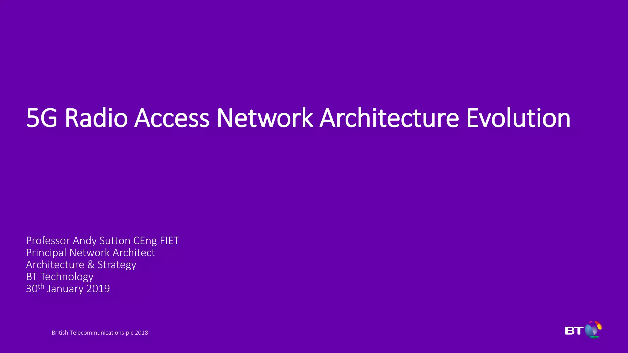 British Telecommunications plc2018 5G Radio Access Network Architecture Evolution Professor Andy Sutton CEng FIET Principal Network Architect Architecture & Strategy BT Technology 30th January 2019