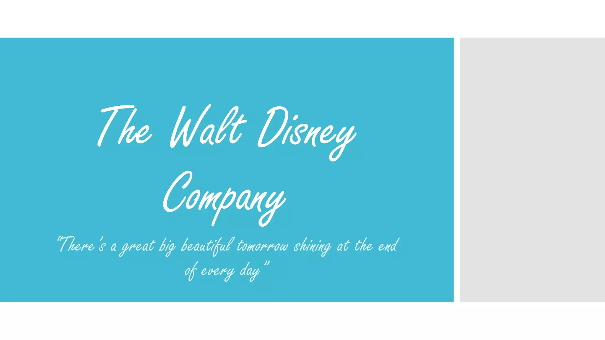 The Walt Disney Company has been a leader in public relations, personal selling, sales promotion, and advertising since it was officially established in 1923. Disney follows Walt's model of having a dream and making it a reality through mind and heart. Their PR focuses on press releases and managing messages about deaths at Disney parks. Personal selling techniques provide consistency in service across Disney businesses. Sales promotions make Disney parks appealing for all ages and bring back classic movies. Disney advertises its parks, hotels, and films while allowing other companies to advertise in the parks to improve the experience for guests.
