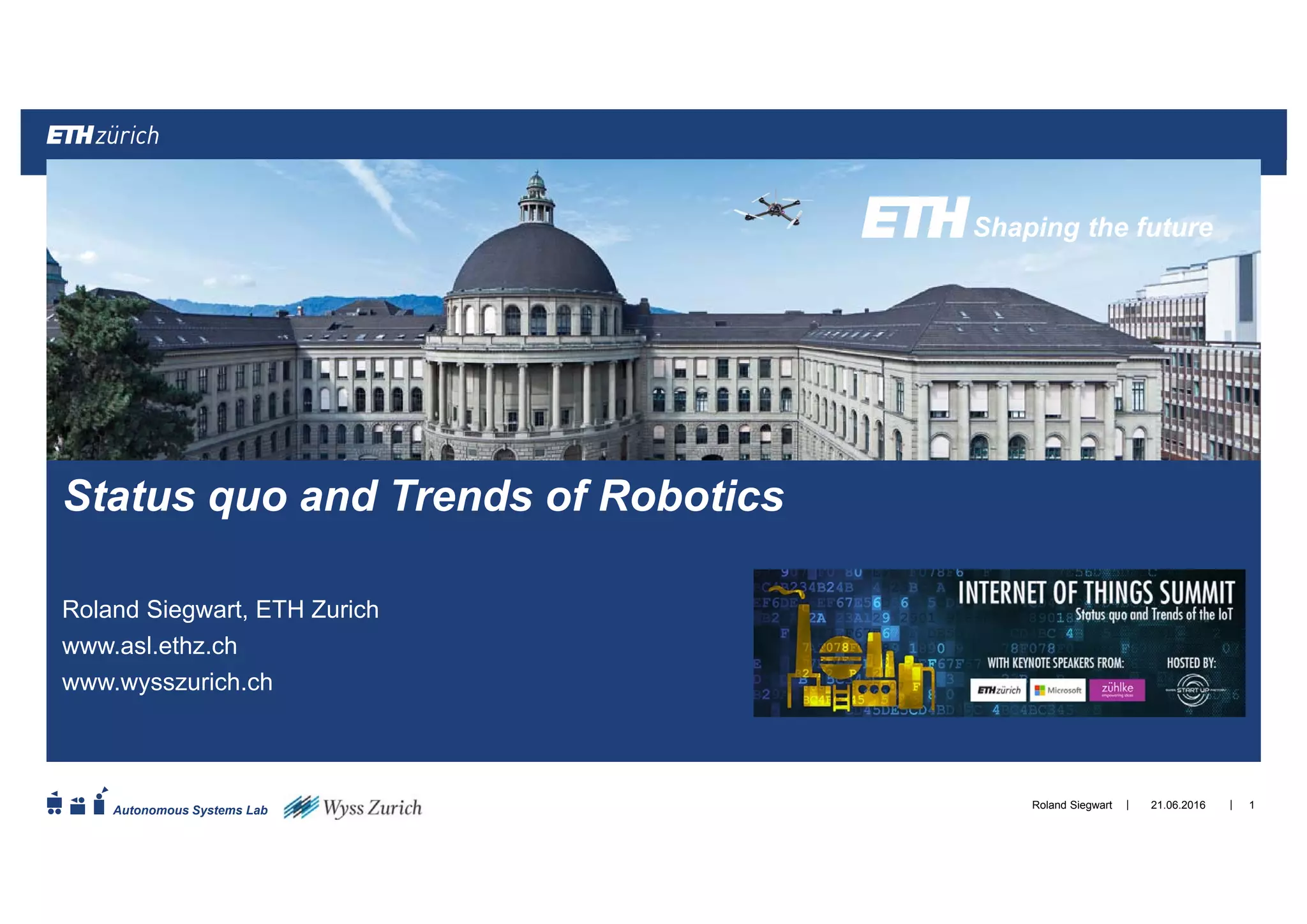 The document discusses trends in robotics and provides examples of robot systems developed by ETH Zurich's Autonomous Systems Lab. It summarizes technologies disrupting industries like microelectronics, computing, and robotics. It then highlights examples of mobile robots, aerial vehicles, and navigation systems created at the lab. It concludes with potential application fields for robotics and Zurich's role as a hub for robotics research.