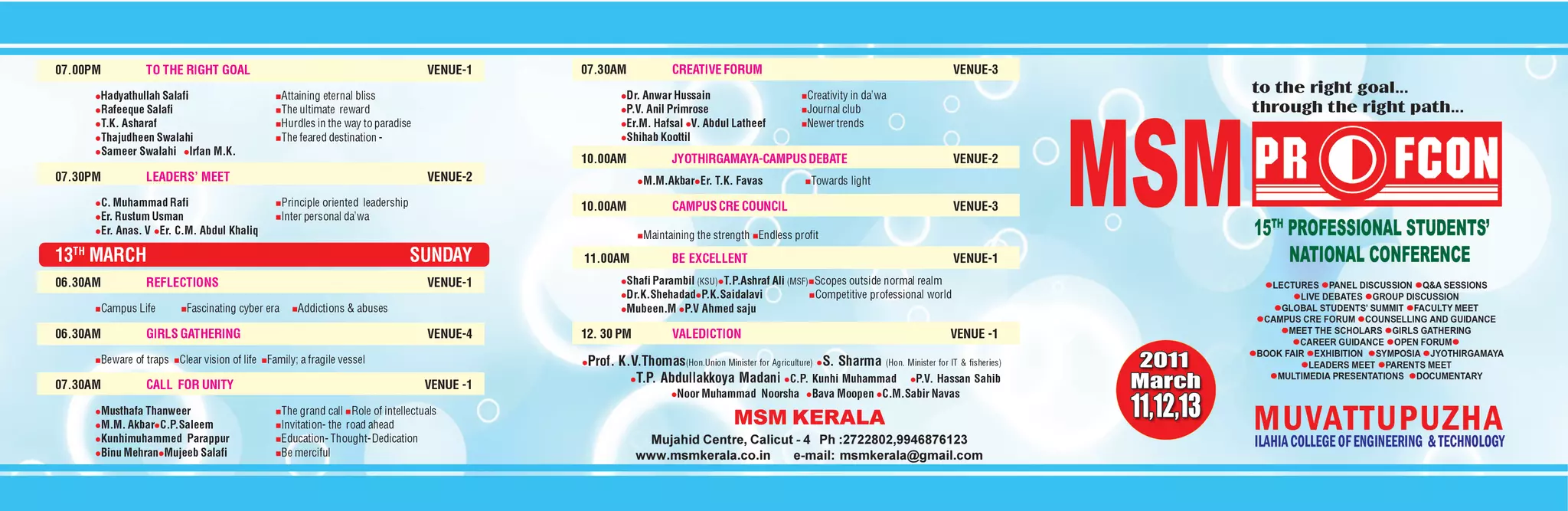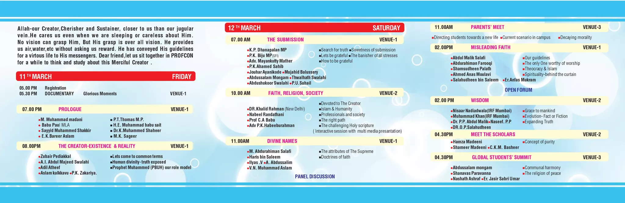 The document outlines a schedule of events and lectures focused on Islamic themes, including leadership, spirituality, and community issues, scheduled over three days. Various speakers and topics are listed, such as the role of intellectuals, inter-personal da’wah, and the significance of submission to God. The gatherings emphasize unity, morality, and the relationship between religion and society.