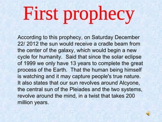 The document summarizes 7 prophecies: 1) On December 22, 2012 the sun will receive energy from the galaxy's center beginning a new cycle. 2) Since 1999, solar changes have altered some people's nature in violent or spiritual ways. 3) Human behavior affecting climate change will cause natural disasters and rising sea levels threatening coastal areas. 4) By 2012, if human behavior doesn't align with nature and galaxy rhythms, systems like computers, economy and religion will fail. 5) A comet could collide with Earth, bringing abrupt physical changes but humans may be able to deflect it. 6) By 2012, galactic light will synchronize beings and enable internal transformation to new realities and limitations being overcome. 7) The seventh