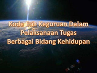 Dokumen ini membahas pengertian kode etik guru, fungsinya dalam melaksanakan tugas, dan akibat pelanggaran terhadap kode etik tersebut. Kode etik berperan sebagai pedoman bagi guru untuk menjaga tanggung jawab, hubungan profesional, dan meningkatkan kualitas pendidikan. Selain itu, kode etik juga mengatur interaksi antara guru dengan murid, rekan kerja, masyarakat, dan pemerintah.