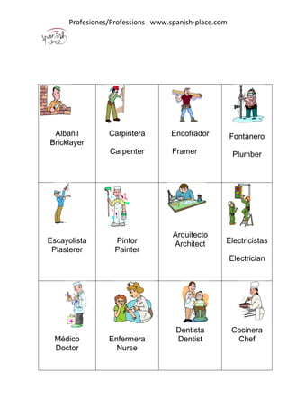 This document lists various professions in Spanish including teacher, hairdresser, postman, firefighter, gardener, garbage man, street sweeper, shopkeeper, policeman, judge, barber, singer, bricklayer, carpenter, framer, plumber, plasterer, painter, architect, electrician, doctor, nurse, dentist, chef, pastry chef, butcher, waiter, and flight attendant.