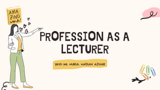 The document discusses the profession of being a lecturer. It introduces Nurul Nadiah Azhar, an English lecturer at ASWARA. A lecturer teaches students in universities, colleges, and other institutions. As a lecturer, Nurul teaches students, ensures they can speak well, boosts their public speaking skills, publishes articles, and supervises students. To become a lecturer requires completing primary and secondary education, obtaining diplomas or degrees, and potentially a master's degree or PhD. Good knowledge of the subject, excellent oral and written communication skills, and ability to manage time are important skills for lecturers. The document closes by encouraging students to follow their passions and dreams.