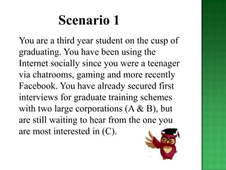 The document describes two scenarios involving social media use and potential employment. In the first scenario, the narrator is applying for graduate training programs and one company screens social media profiles. The second scenario involves applying for international work opportunities, where two organizations use LinkedIn to connect with applicants. The document asks questions about how to present oneself professionally online and how employers may interpret various social media presences and behaviors.