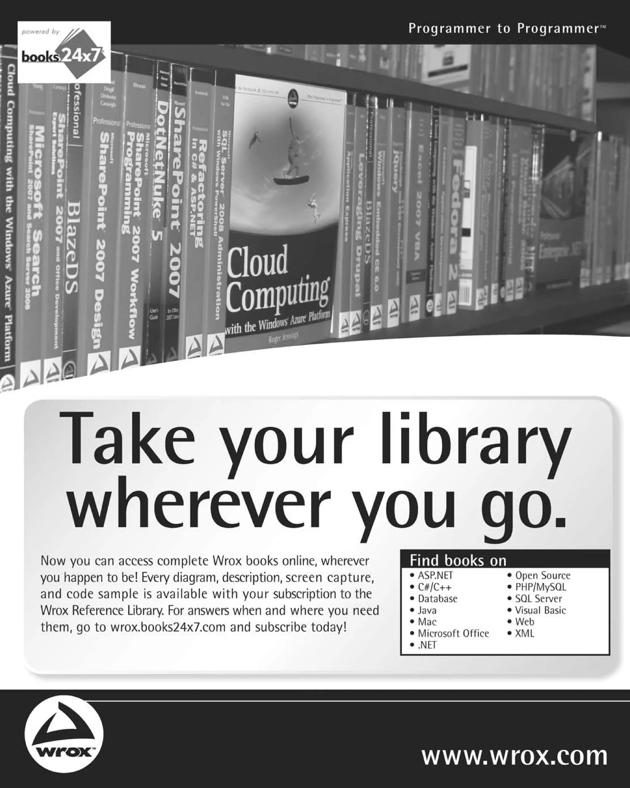 This document provides information about joining an online discussion forum and community for Wrox publishers. It lists ways to interact with other programmers on their discussion forums at p2p.wrox.com. It also advertises their online book library at Books24x7.com and short code samples and tutorials available for download at Wrox Blox. It encourages signing up for their monthly newsletter and browsing their catalog of books on various programming topics. It concludes by providing contact details to give feedback.