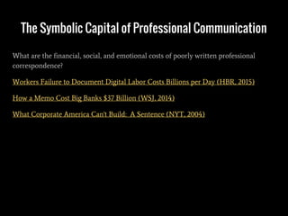 This document provides guidance on strategic professional communication. It discusses the costs of poorly written professional correspondence and common genres of professional letters. General tips are outlined for professional email correspondence, including using a greeting, body, and valediction. Models of effective professional emails, letters of recommendation requests, and thank you notes are also presented. Additional guidance is given on increasing the likelihood of feedback, timelines for letter requests, formatting thank you notes, and expressing gratitude.