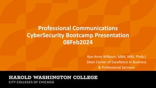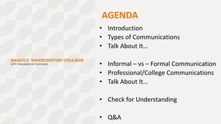 This document provides an overview of a presentation on professional communications. It covers the following key points: