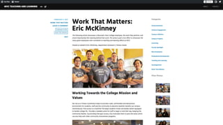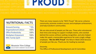 The presentation discusses professional development (PD) strategies tailored for contemporary learners, emphasizing a user-centered approach that enhances engagement through meaningful and memorable experiences. Key elements include audience-focused delivery, thematic events, and the use of social media for promotion and engagement. Challenges and successes from past events at Mountain View College are highlighted, along with specific suggestions for improving future PD initiatives.